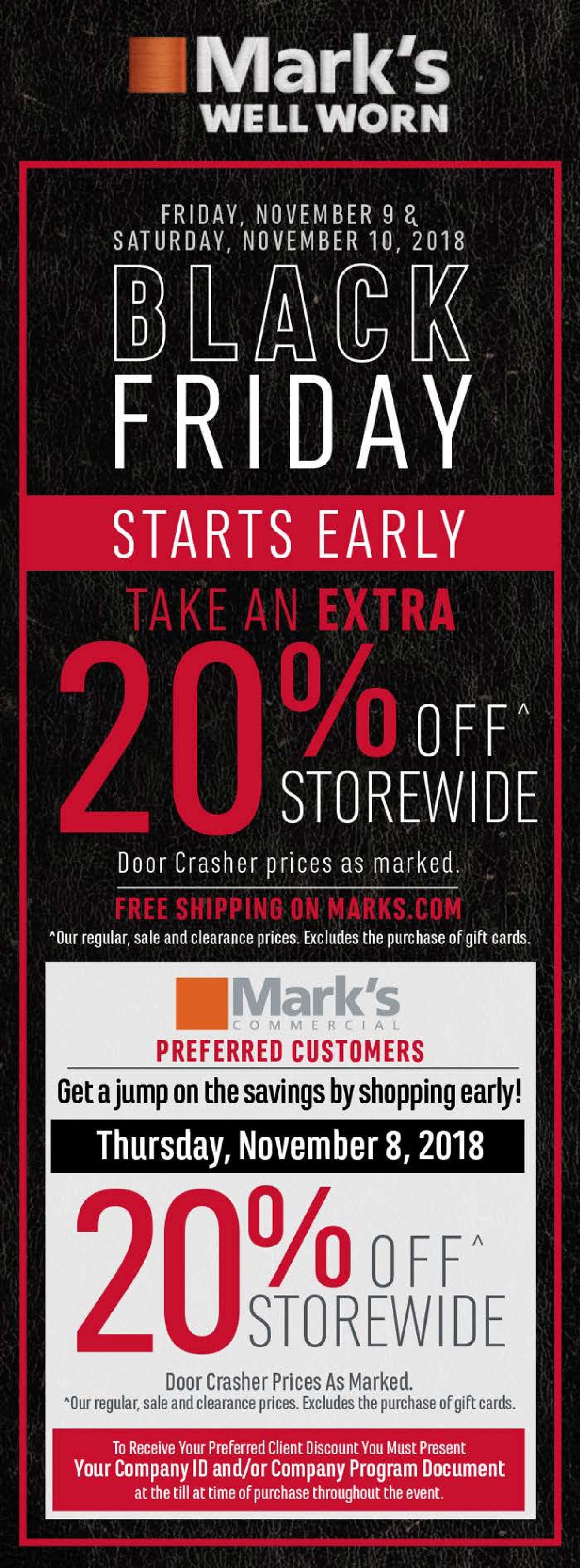 Get early access to Mark’s Storewide Sale on November 8, 2018. Only preferred clients of Mark’s Commercial get 20% off and can shop a day in advance of the public, Thursday, November 8th, only.