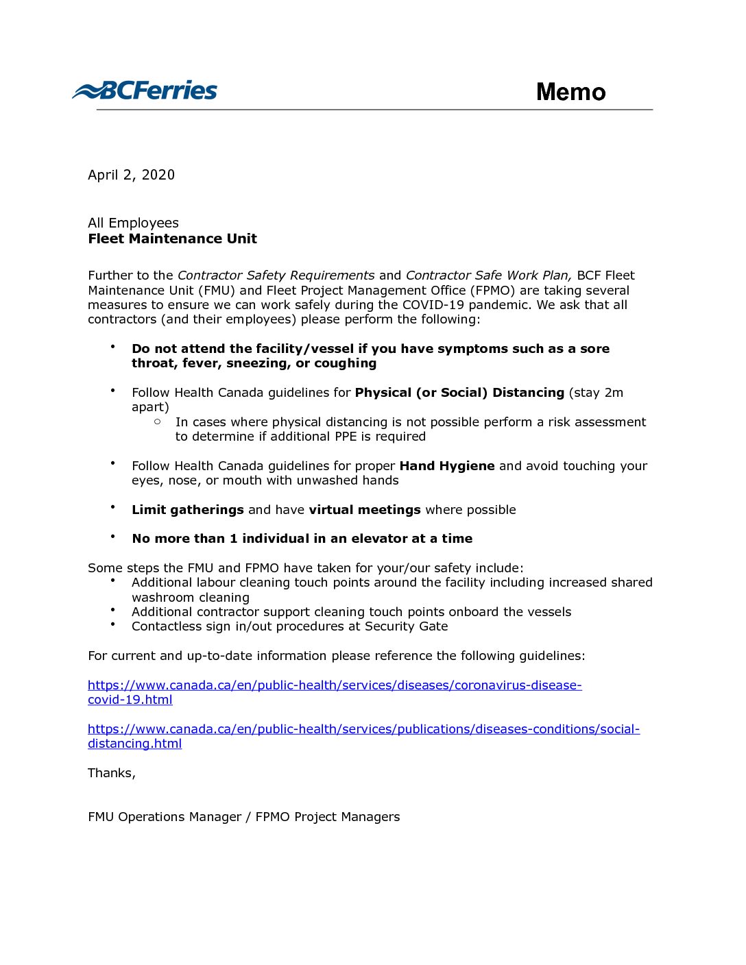 Please click on the image to open the Contractor Memo COVID 19 Precautions April 2nd 2020