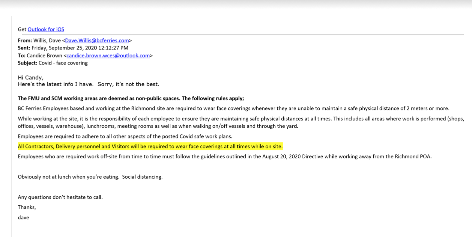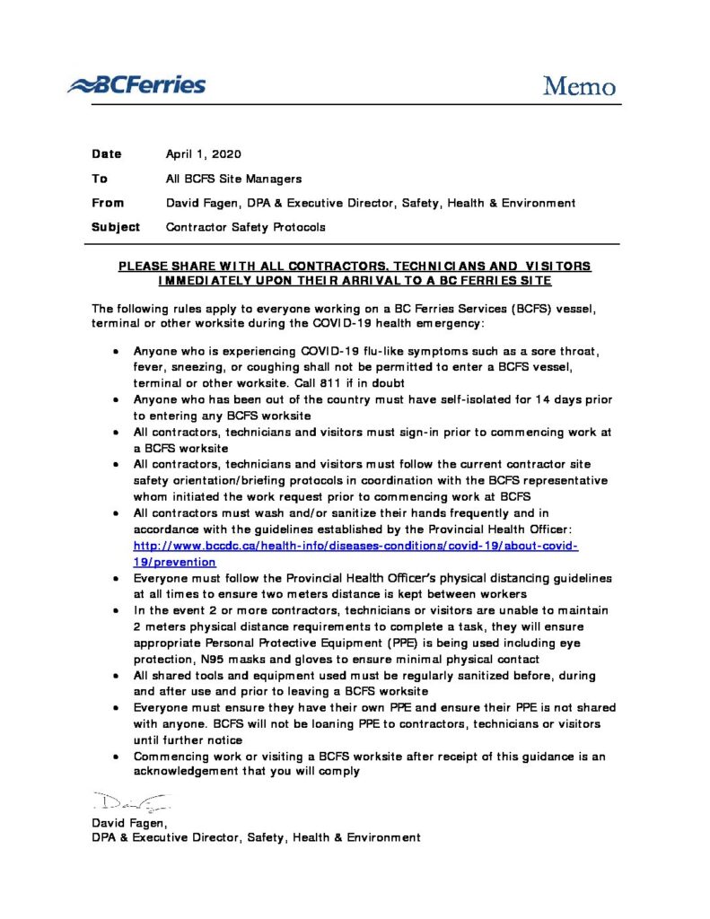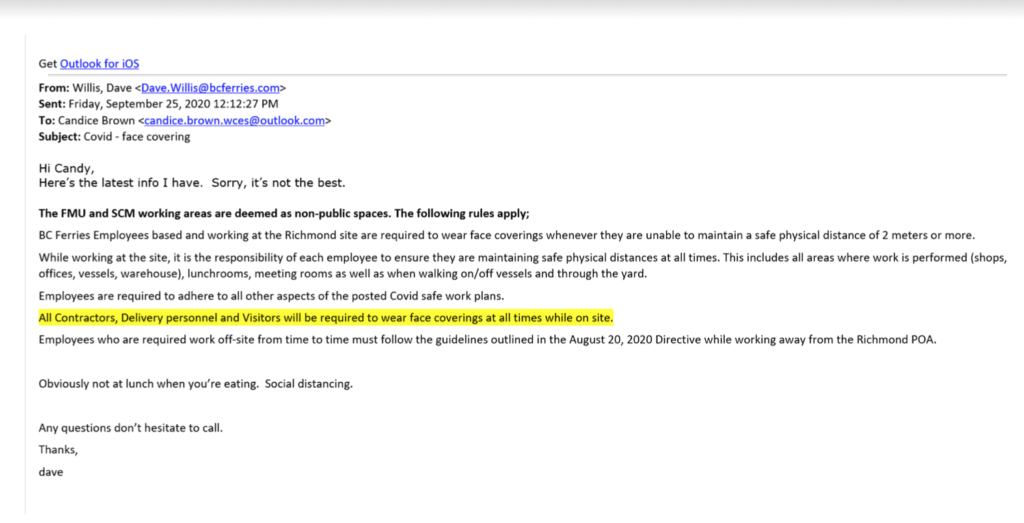 I have attached again the BCFS/FMU mandatory COVID-19 safety protocols that were attached with the first schedule prior to starting this year’s refit. At our start up toolbox meeting all staff were personally given a copy and it was read out loud. WCES staff acknowledged and signed these rules.